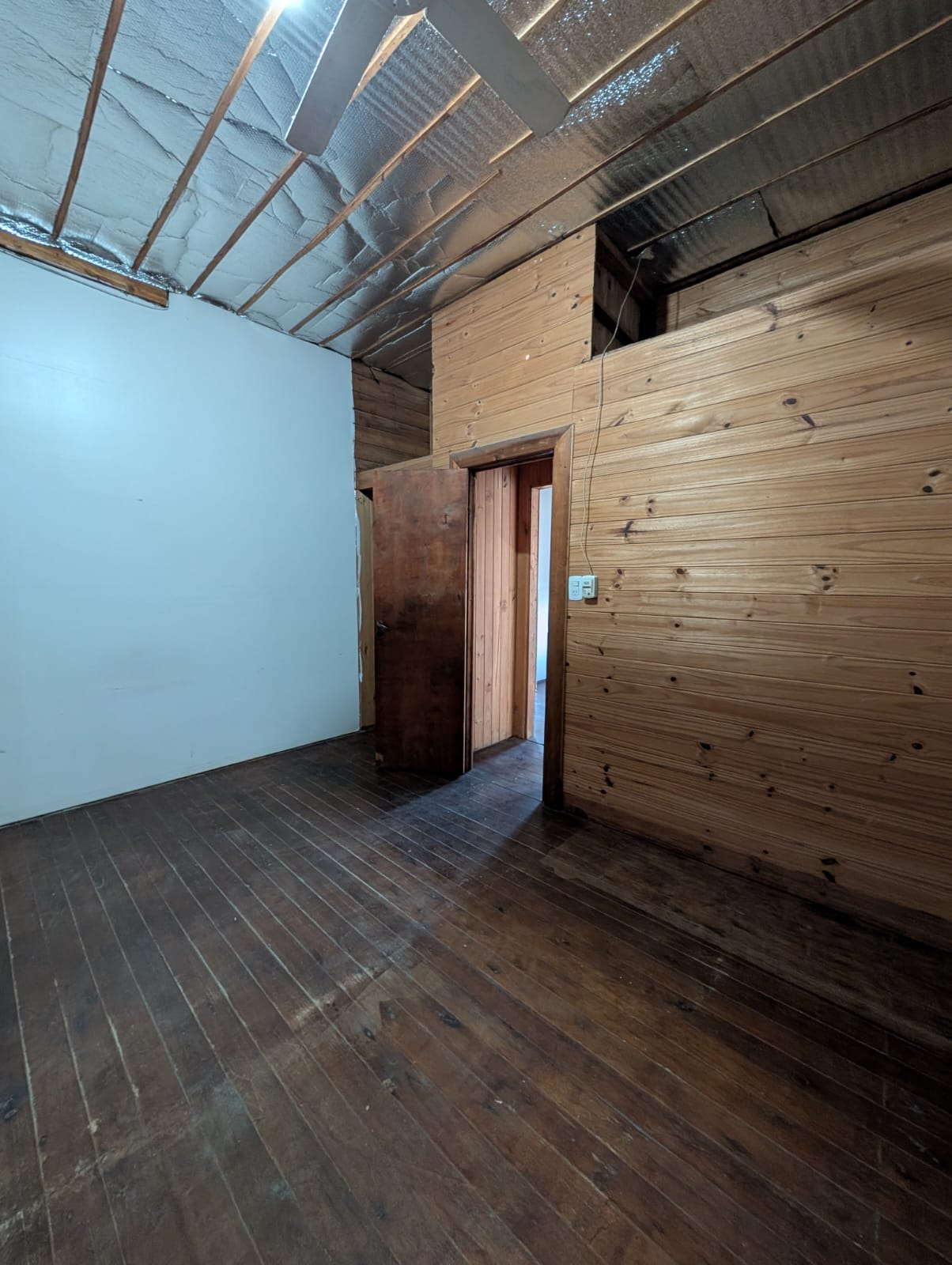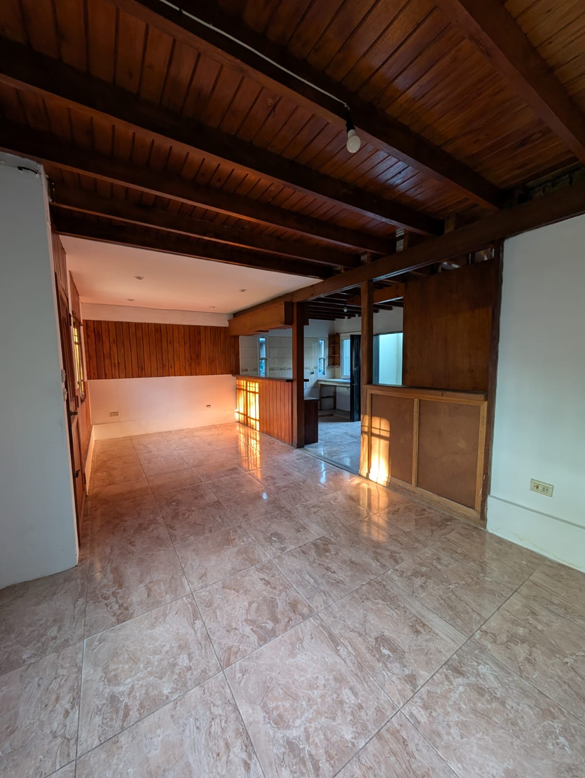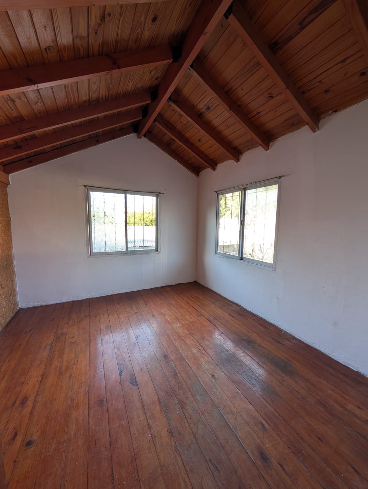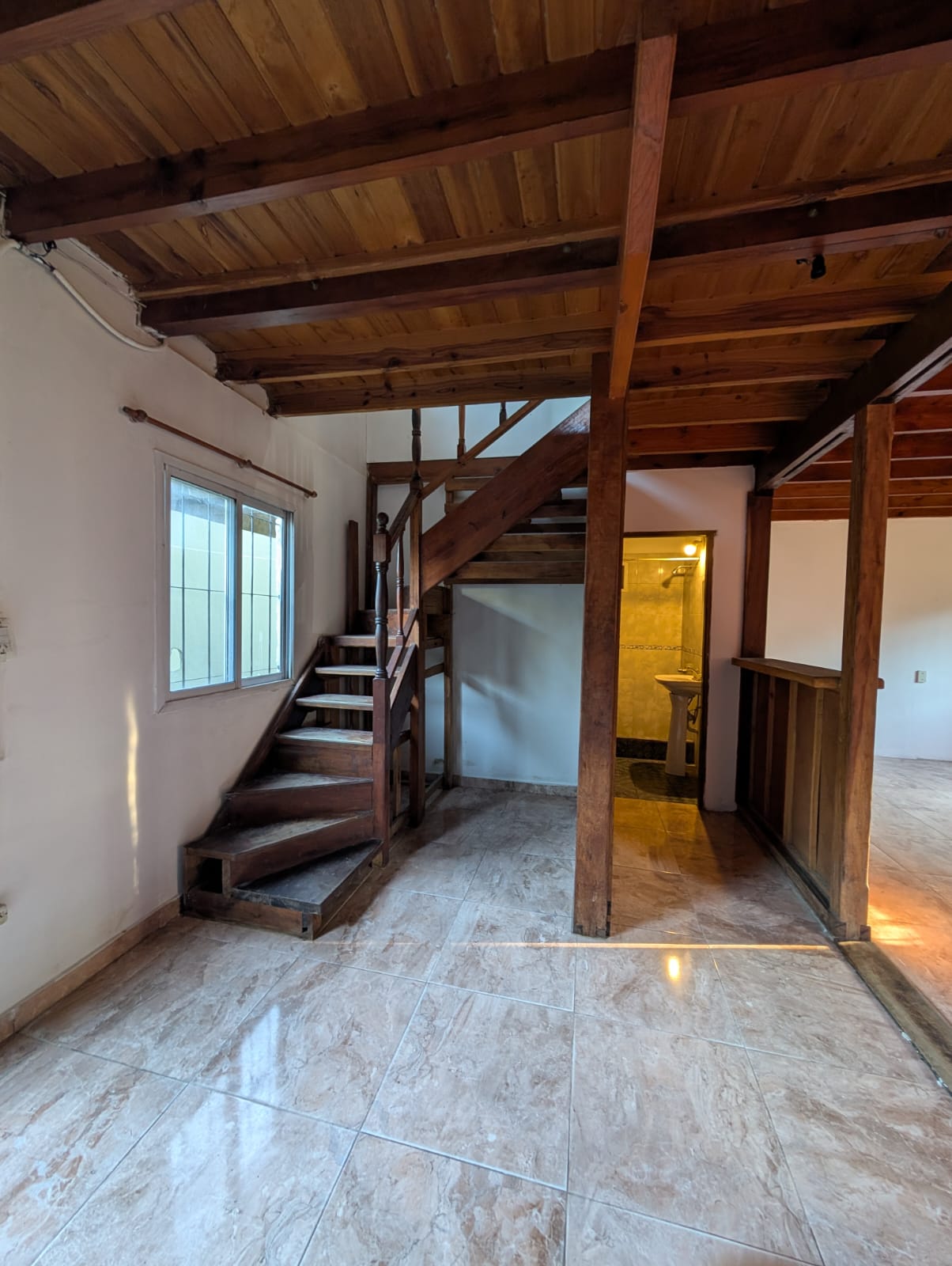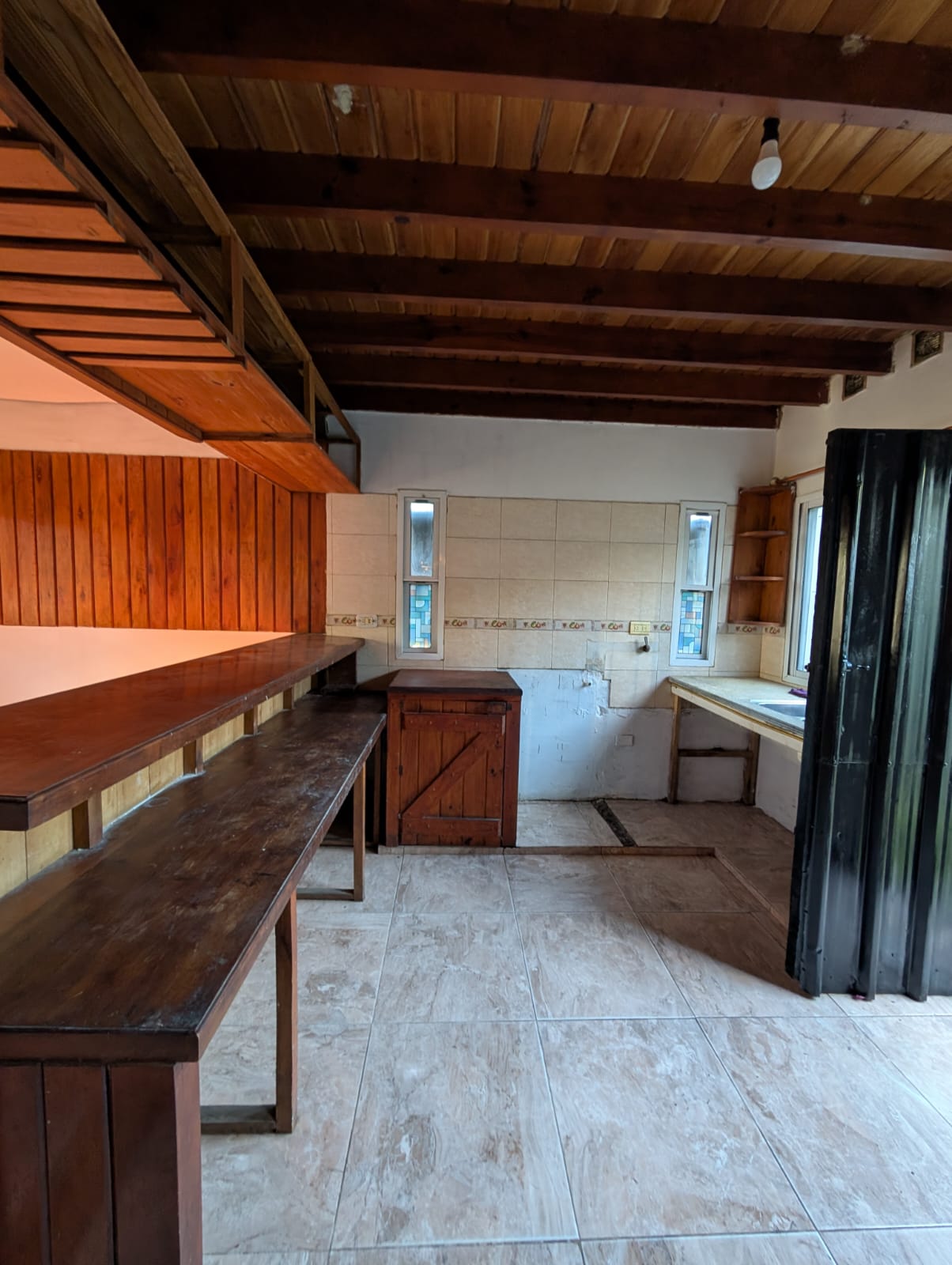 vivienda tipo cabaña en dos plantas, cocina con sala de estar/comedor, pasa platos, baño instalado